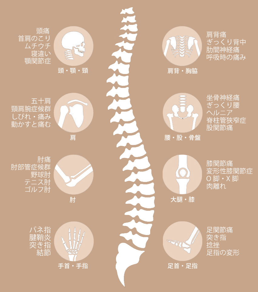頭のてっぺんから足の指先にいたるまでのあらゆる痛み・シビレ・こり・動作制限が適応となります。状態をおおきく①骨格のズレやゆがみによる神経圧迫、②筋肉の炎症、③それらがあわさったものにわけ、❶骨格の矯正と❷理学療法(主に超音波治療)により治癒させます。
